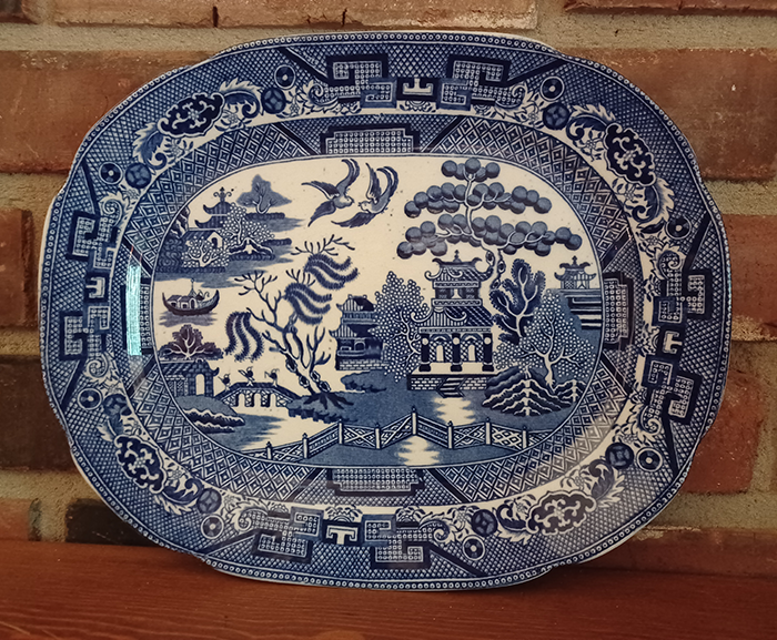 What sets Blue Willow apart from other transferware patterns is the romantic tale embedded in its design. At first glance, the pattern looks like a peaceful outdoor scene featuring a pagoda, willow tree, pine tree, bridge, boat, and two birds in flight. But these symbols tell a deeper story of forbidden love.